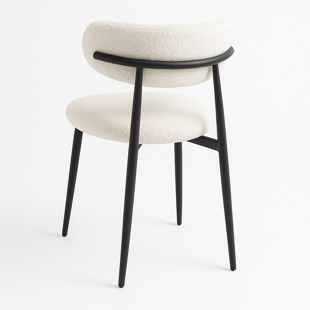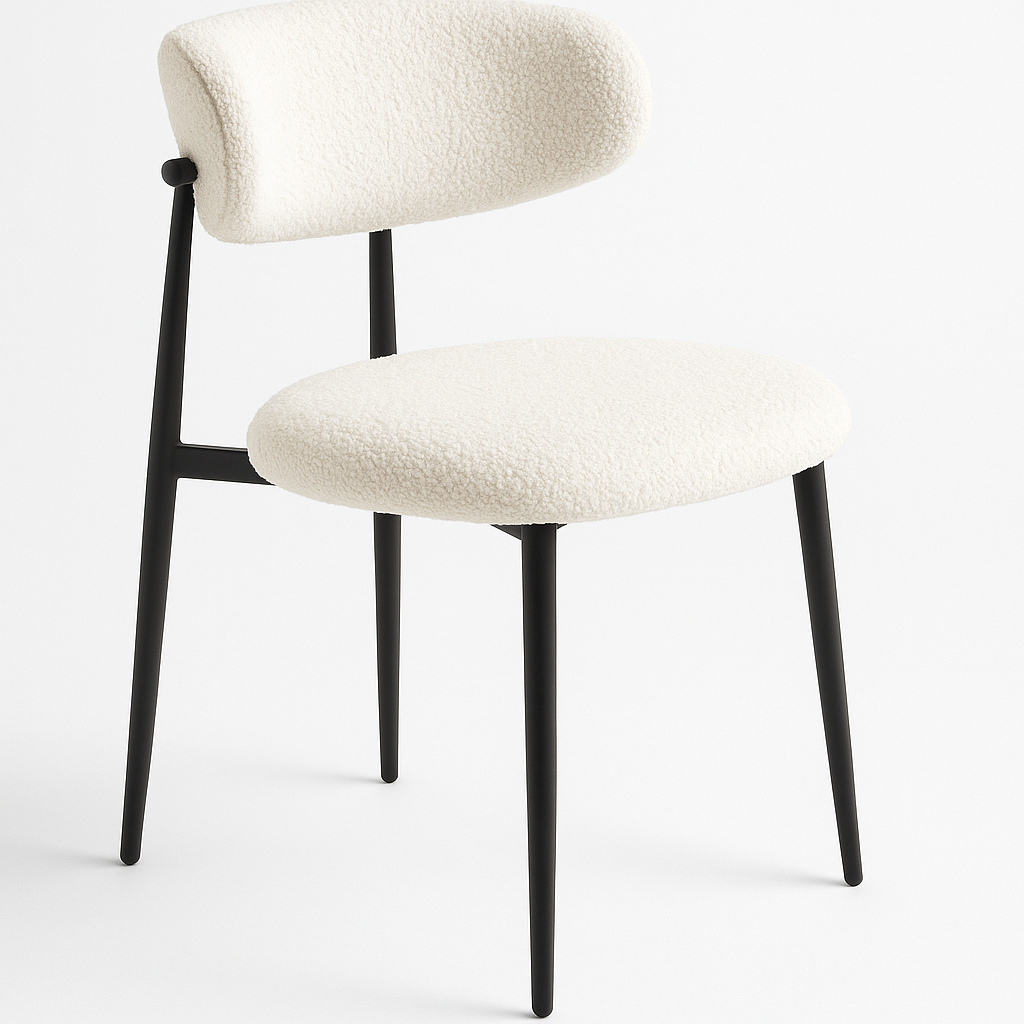 Eetkamerstoel Jaxx brengt rust en elegantie in je interieur. Met zijn zachte bouclé stof in ivoor en een slank zwart metalen frame past deze designstoel perfect in een Japandi of modern interieur. De comfortabele zitting en stevige constructie (draagvermogen tot 120 kg) maakt eetkamerstoel Jaxx ideaal voor lange diners of gezellige avonden aan tafel. Een stijlvolle en tijdloze eetkamerstoel die warmte en verfijning toevoegt aan elke ruimte.